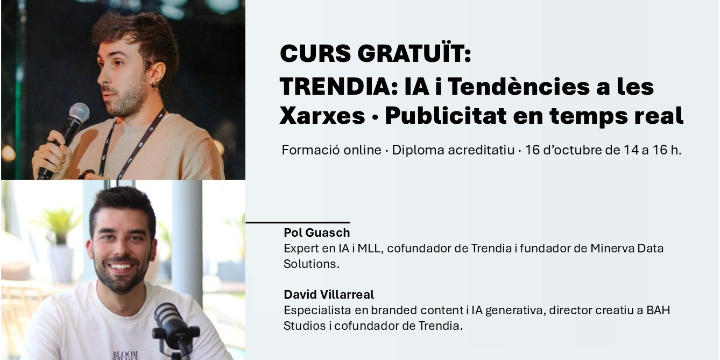 Aquesta formació, amb Pol Guasch i David Villarreal, t’ensenyarà a identificar què és una tendència, com funcionen les eines d’IA per monitoritzar patrons i crear solucions de màrqueting. Veurem l’ús de la IA generativa en continguts i campanyes automatitzades. I acabarem amb un debat sobre els límits entre creativitat i algoritme.